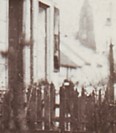 | Am südöstlichen Ende der Schlewiesstraße stand das Wohnhaus Nummer 11, an das sich noch ein kleiner Kolonialwarenladen anreihte. Im Hintergrund ist die Katholische Kirche schemenhaft zu erkennen. |