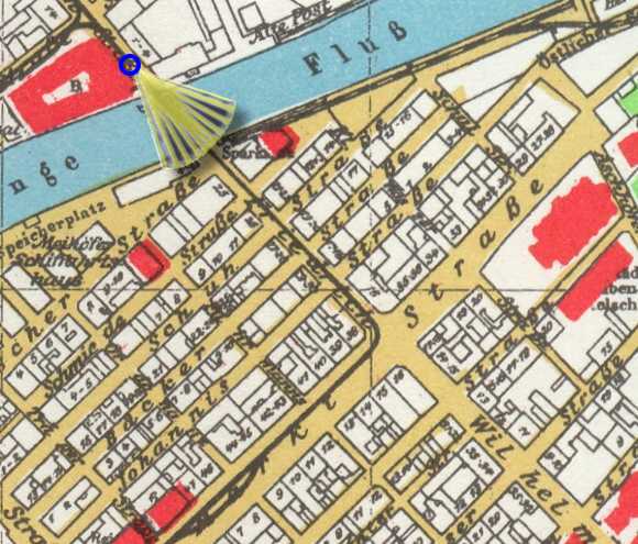 | Über die Börsenbrücke ein Blick in die Friedrich-Wilhelm-Straße mit der Reformierten Kirche. Links der Turm der Johannis-Kirche. | |