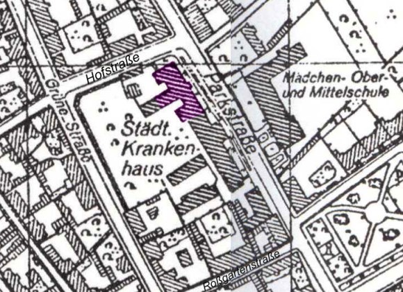 Das Städtische Krankenhaus in der Parkstraße, die Bebauung um 1940. Der Grundriß des ursprünglichen Baues von 1902 ist farbig markiert. | |