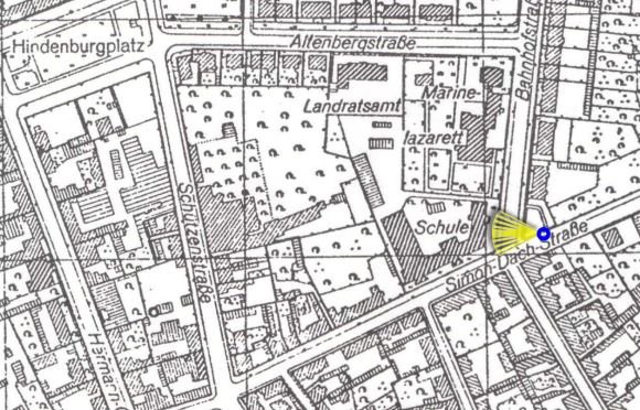 | Fragment eines Plans 1:5000. Bearbeitet: Der Regierungspräsident in Gumbinnen. Herausgegeben: Hauptvermessungsabteilung I, Königsberg (Pr.) 1942 |