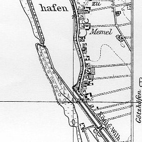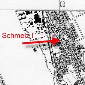 Die Schule "Schmelz III" in der Mühlenstraße 88, beim untersten roten Pfeil, nahe dem Sägewerk Appelhagen. | |||||||||||