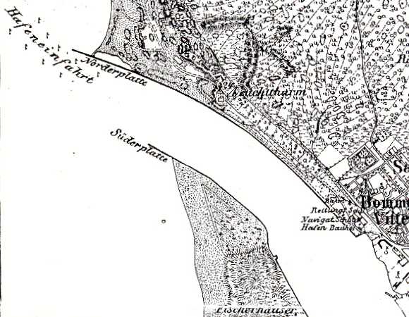 On the topographical map from 1868 its modest length is to be seen. An extension started in 1900 to counteract the danger of permanent silting of Memel's harbor entrance. Up to the first World War it was completed with about 500 meters length but merely makeshiftly.