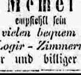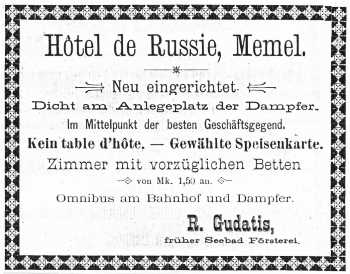 Werbung im Memeler Adreßbuch von 1866. Unter dem Besitzer R. Gudatis erhielt das Hotel den Namen "Hotel de Russie", nachdem in der Libauer Straße 20 der alte Gasthof gleichen Namens geschlossen worden war. ![]() |