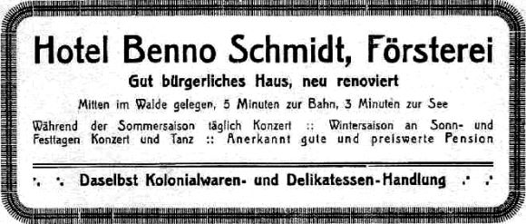Eine Ansichtskarte aus der Zeit um 1910 verrät, daß das Pensionat Lardong mit der Handlung von Andenken und Geschenkartikeln aus Försterei der Vorgänger von Schmidts Hotel gewesen ist.
