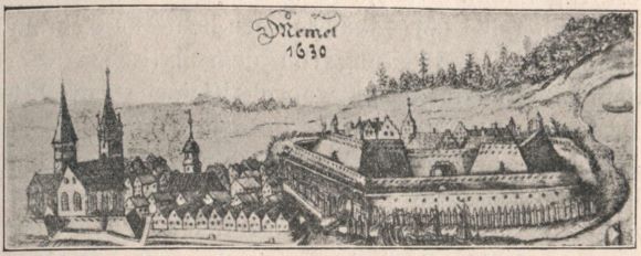 An dem Ausfluss des Kurischen Haffes in die Ostsee und der Mündung der Dange (Danga = Fluss im Altpreussischen) lag um das Jahr 1000 n. Chr. eine nicht unbedeutende Siedelung der Kuren, die von Kurland her bis zur Mündung der Memel den ganzen Küstensaum des Haffes bewohnten und diesem eigenartigen Binnengewässer den Namen gaben. Den für Fischerei und Schiffahrt gleich günstig gelegenen Ort, welcher durch eine Burg auf den landeinwärts gelegenen Höhen geschützt wurde, besuchten hanseatische Kaufleute aus Lübeck, Bremen, Hamburg etc., um Salz, Eisen, Waffen, Schmuck gegen Felle, Flachs, Bernstein und Wachs einzutauschen. Zwischen Nehrung und Festland, auf beiden Seiten durch vorspringende, beträchtliche Sandberge eingeschlossen, bildete das heutige Tief zugleich einen Naturhafen, der den Schiffen jederzeit sicheren Schutz gewährte. Klaipeda wurde der Ort genannt. Der Name lässt keine sichere Deutung zu, ist aber bei den Litauern noch heute im Gebrauch. Viel hätte die Ableitung von dem lettischen Worte Klaip = Brot für sich, wonach Klaipeda soviel wie »Brotstadt« bedeuten würde in dem Sinne, dass man hier leicht »zu Brot«, d. h. zu Erwerb kommen könne. Die ersten Boten des Christentums an diesem Gestade waren die livländischen Schwertbrüder. Nach Uebereinkunft mit dem Deutschorden in Preussen beschlossen am 1. August 1252 der Bischof von Kurland und der Statthalter von Seyne den Bau einer Burg. Sie erstand rasch, zunächst aus Holz, später aus Steinen aufgeführt, auf dem linken Ufer der Dange, wo dieselbe sich in das Haff ergiesst, und erhielt den Namen Mummelburg, weil in damaliger Zeit das Haff als erweiterte Mündung der Mummel (Memel) galt. So bezeichnete man die sich aus dem alten Klaipeda entwickelnde Stadt ebenfalls mit Mummel, woraus sich dann Mümmel, Memmel und schliesslich Memel herausbildete. Mithin ist Memel mit dem Gründungsjahr 1253 die ä l t e s t e S t a d t O s t p r e u s s e n s. Bereits 1257 wurde ihr das lübische Recht verliehen.