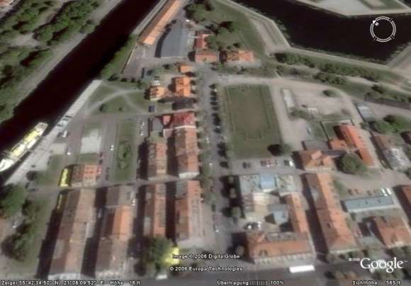 Wo die St. Johannis-Kirche stand, erinnert eine kleine Hecke in Form des Kirchengrundrisses an die frühere Stadtkirche. Nur das einstige Gemeindehaus samt Pfarrhaus (links daneben) stehen heute noch am östlichen Ende des Platzes.